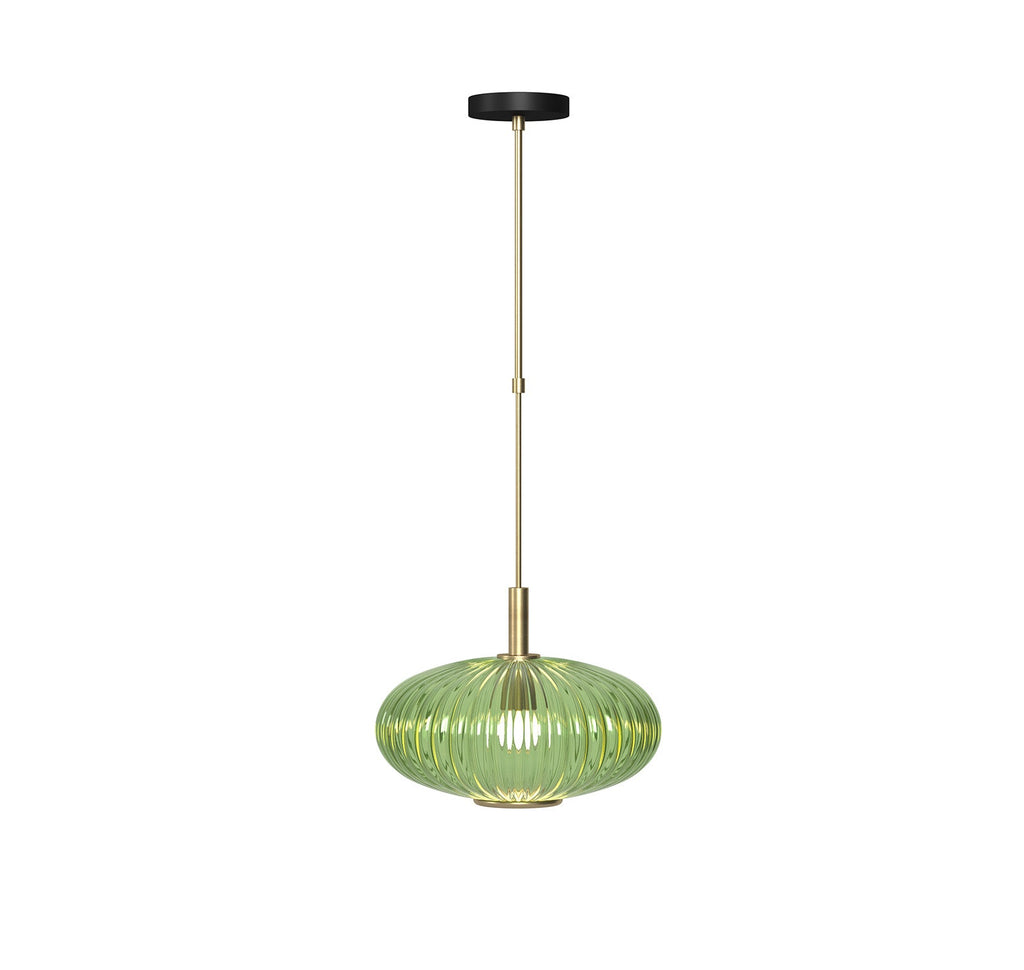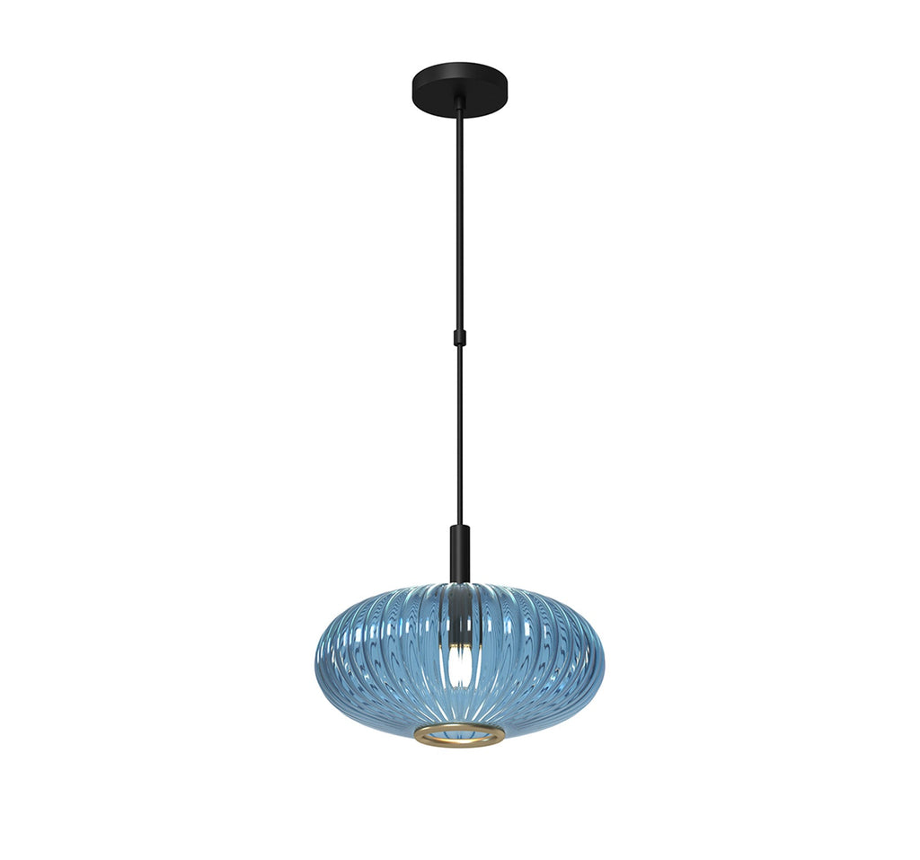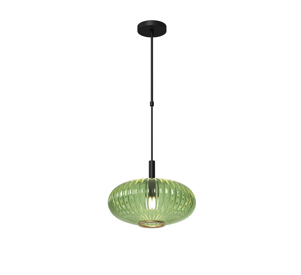 The single glass pendant is available in both brass and matte black finishes, paired with your choice of vintage-inspired green, blue, or smoke glass shades with brass accents.