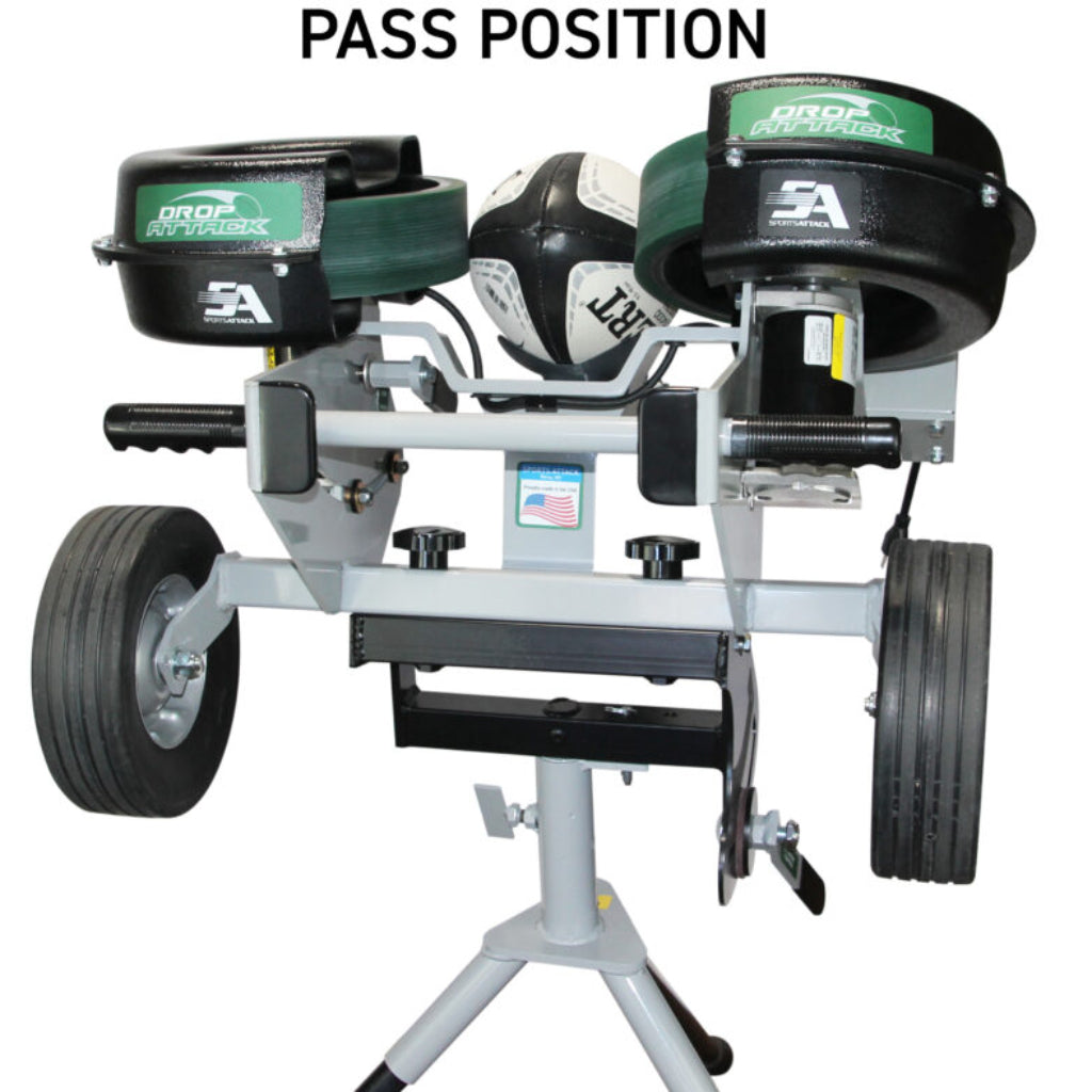 The NEW DC Model Drop Attack Rugby Machine is easy to move anywhere on the field with speed and power. Its solid polyurethane wheels grip the rugby ball tightly for accurate passes and kicks, while protective guards keep the wheels safe and dry in bad weather.