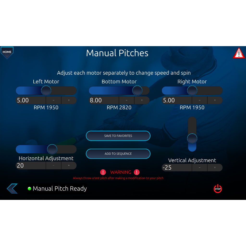 Manual Mode Functions like a basic Hack Attack with full control of motors and actuators. Customize spin, speed, and location, then save pitches as favorites or sequences. Adjust locations instantly using sliders or +/- buttons.