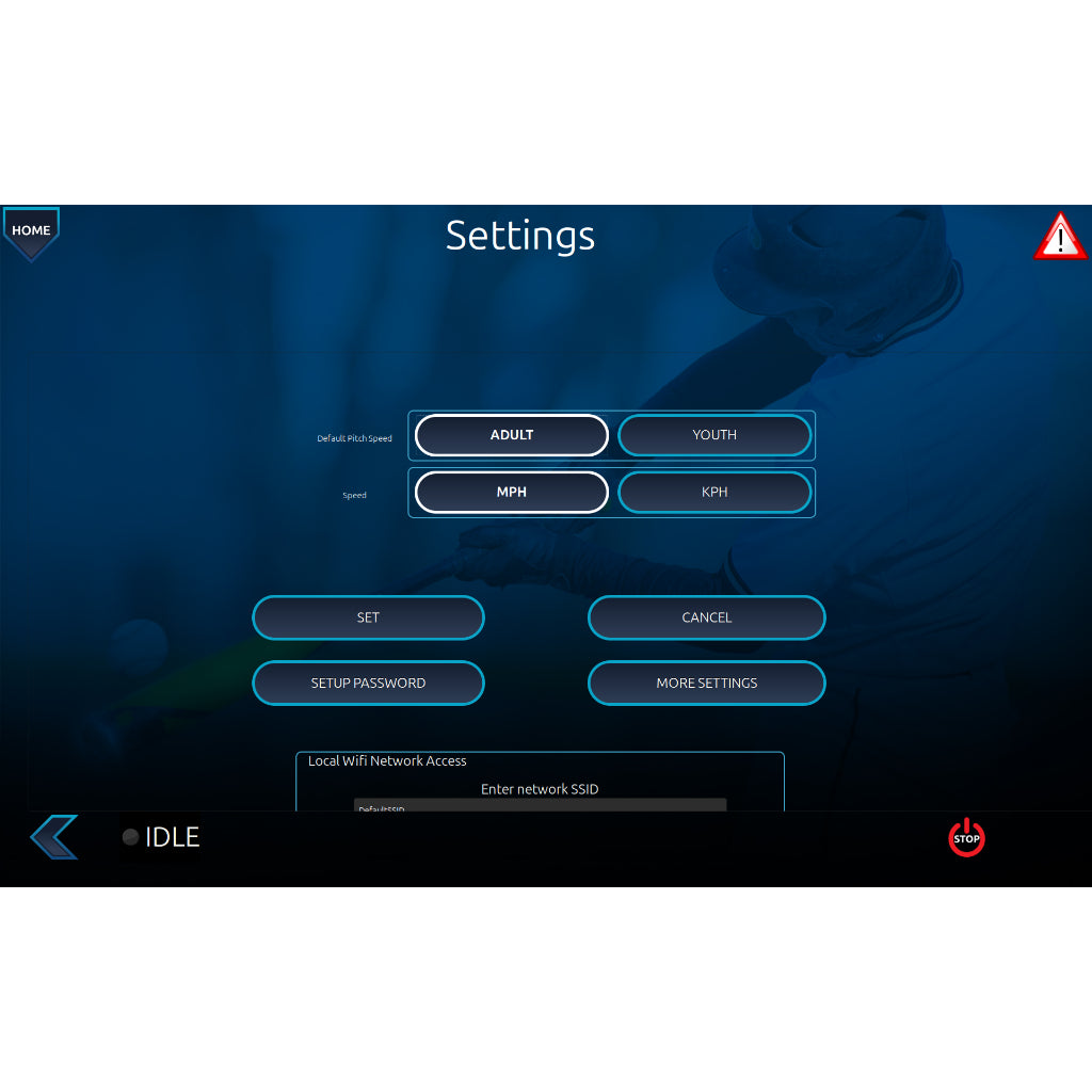 Utilities & Settings Switch between adult and youth skill levels, adjust speed units (MPH/KPH), set timeouts, and manage password security. Track pitch counts, check diagnostics, and update software directly on the machine.