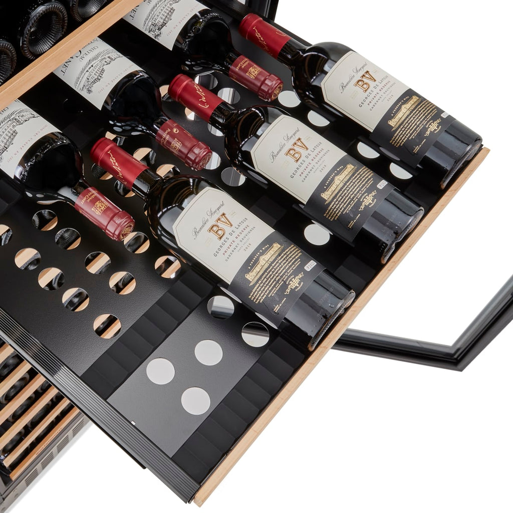 The Wine Enthusiast Latitude L 26" Smart Wi-Fi Wine Cellar with Luxury Spacing and Steady-Temp™ Cooling delivers unmatched versatility, premium protection, and sophisticated style for serious wine collectors. Designed with extra-wide universal shelves and four-inch luxury spacing, it accommodates Bordeaux, Burgundy, Champagne, and even 1.5L magnums—all while preventing label scraping and preserving the value of your collection. Smooth-rolling shelves with rubber scalloped supports ensure every bottle rests securely with minimal vibration.